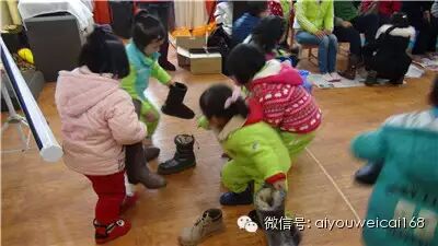 进行第二个游戏帮爸爸妈妈穿鞋,家长首先把自己的鞋脱掉放在另一侧,开始后孩子迅速找到自己爸爸妈妈的鞋子并以最快的速度帮爸爸妈妈的鞋子穿好: