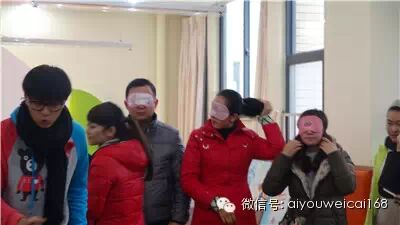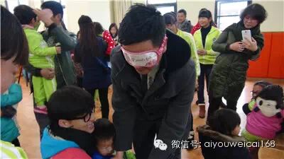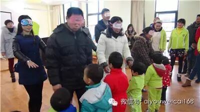 家长与孩子进行游戏“瞎子摸鱼”,爸爸妈妈带上眼罩后用手找到并摸出自家的宝宝: